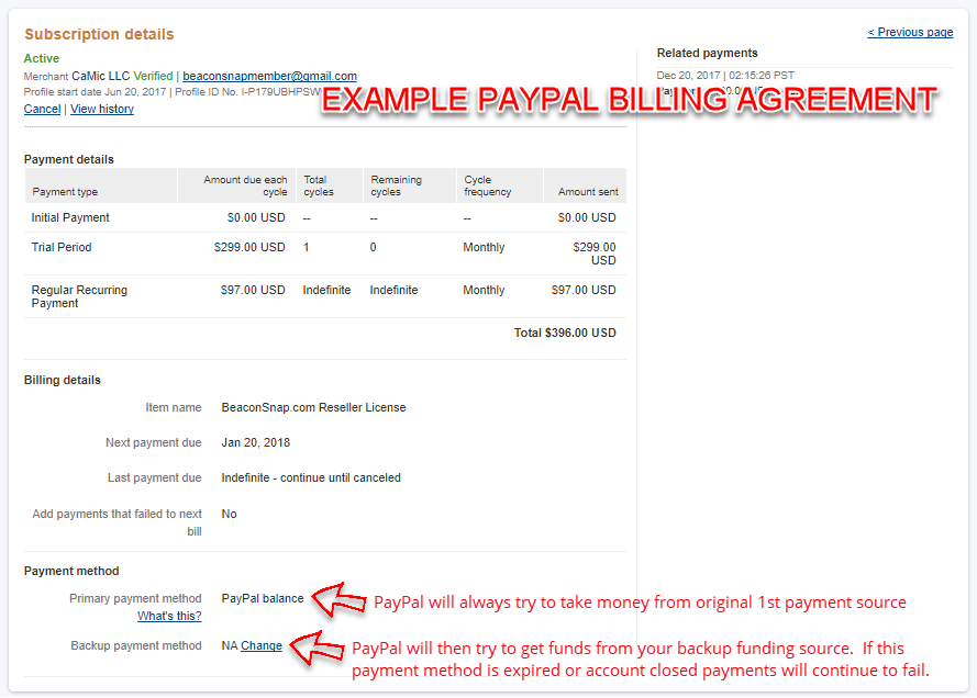 Once your payment method has been updated CaMic LLC will be able to process your monthly subscription fee via PayPal and your service will not be interrupted (Note: Updating your backup funding source will not reactivate your account. Please contact us in the support desk to let us know you have updated your backup funding source.)